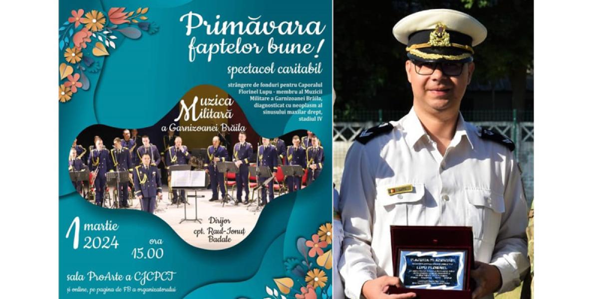 • acesta va fi susținut de Muzica Militară a Garnizoanei Brăila pentru ajutorarea caporalului Ionuț Lupu, diagnosticat cu neoplasm al sinusului maxilar drept, stadiul IV • evenimentul va avea loc pe 1 martie, ora 15.00, în Sala ProArte a Centrului de Creație Brăila, iar intrarea este liberă