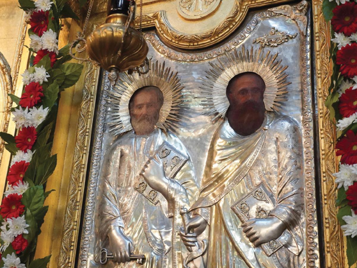 Sfântul Apostol Petru, fiul lui Iona și fratele Apostolului Andrei, s-a născut în Betsaida Galileei. Numele său iudeu era „Simon”, însă Mântuitorul îl va numi „Chifa” (piatră) adică Petru. După o pescuire minunată pe lacul Ghenizaret, Petru este chemat să devină „pescar de oameni”. Sfântul Apostol Petru este cel care mărturisește între iudei dumnezeirea Lui Hristos, dar se și leapădă de El, atunci când Mântuitorul este prins, spre a fi răstignit. După Înălțarea Domnului la Cer, Petru ia cuvântul în adunarea ucenicilor și aleg ca apostol pe Matia în locul lui Iuda vânzătorul. În ziua Cincizecimii, după predica Sf. Apostol Petru, se botează trei mii de oameni. Sfântul Apostol Petru a propovăduit Evanghelia Domnului în Ierusalim, Iudeea, Samaria, Asia Mică și până în Babilon și, în ultima parte a vieții, în inima Imperiului Roman, la Roma. A murit răstignit pe cruce, cu capul în jos, în anul 67 d. H., în ziua de 29 iunie.