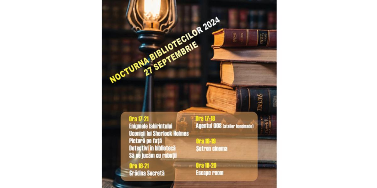 • cea de a XV-a ediție a Nocturnei Bibliotecilor, având ca temă „Noaptea Detectivilor de Carte”, se va desfășura vineri, 27 septembrie, începând cu ora 17.00 • cei prezenți la eveniment vor participa la „incursiuni pline de creativitate în lumea romanelor polițiste, mistere și rezolvarea de enigme (cu surprize și provocări), proiecții de filme și ateliere handmade”