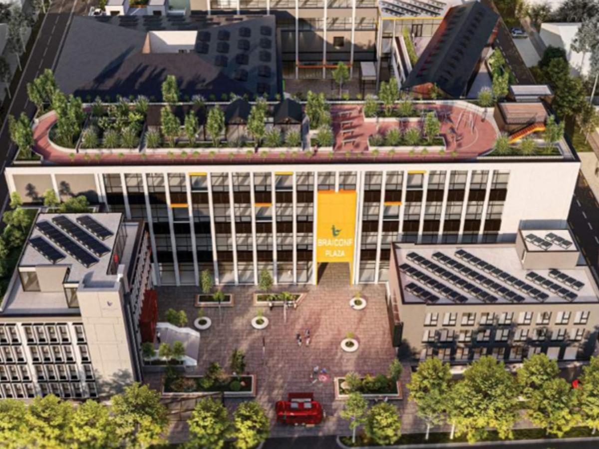 Sursa citată precizează că designul ”Braiconf Plaza” este gândit să combine estetica industrială cu funcționalitatea modernă, folosind materiale durabile și eficiente energetic. De asemenea, elementele de arhitectură ar trebui să includă: beton aparent șlefuit și cărămidă aparentă, terase verzi și acoperișuri de grădină, panouri solare și stații de încărcare pentru mașini electrice, climatizare geotermală, eficiență energetică, precum și fațade oglindă încălzite.