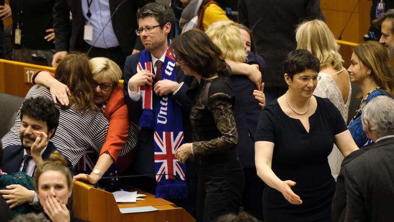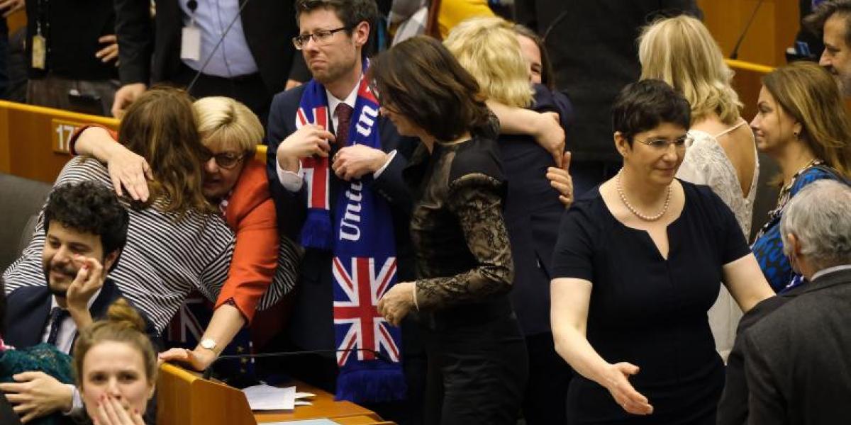 Imediat după vot, care a pecetluit plecarea eurodeputaţilor britanici, numeroşi europarlamentari şi-au dat mâna în hemiciclu şi au intonat cântecul scoţian de rămas bun „Auld Lang Syne” (Nu este decât la revedere), unii fluturând eşarfe în culorile drapelelor britanic şi european. Eurodeputații britanici anti-Brexit nu și-au ascuns părerea de rău, și-au îmbrățișat colegii și au plâns.