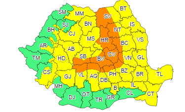 Judeţele care se vor afla sub incidenţa codului portocaliu sunt: Caraş-Severin, Mehedinţi, Gorj, Vâlcea, Argeş, Sibiu, Braşov, Prahova, Buzău, Covasna, Harghita, Bacău, Neamţ şi Suceava. Majoritatea celorlalte zone ale ţării, inclusiv Capitala, se vor afla sub avertizare Cod Galben de precipitaţii.