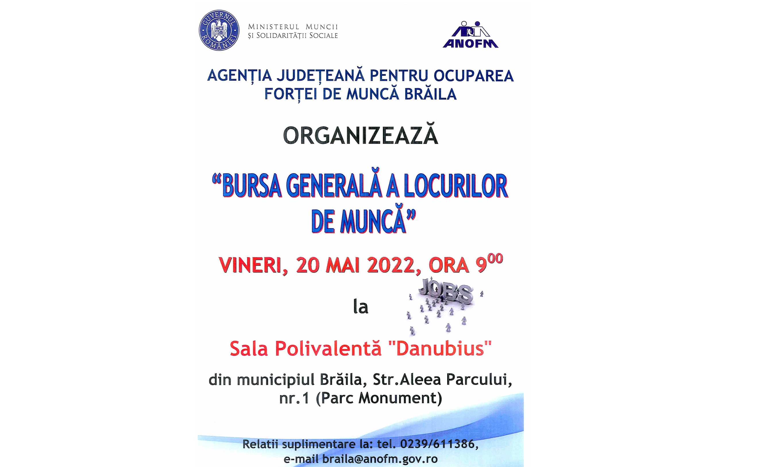 Agenţia Judeţeană pentru Ocuparea Forţei de Muncă Brăila organizează, vineri, 20 mai 2022, “Bursa generală a locurilor de muncă“, la Sala Polivalentă Danubius, începând cu ora 09.00.