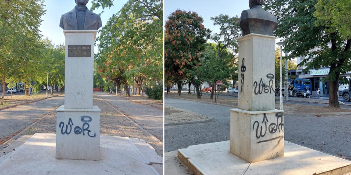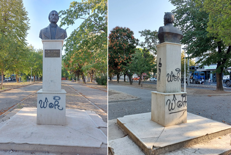 * în vara anului trecut, prezentam cazul edificiului public de pe B-dul Independenței, vandalizat de indivizi fără pic de respect pentru istoria Brăilei * este vorba de bustul marelui om de cultură Naum Vechilargi, avocat la Brăila în urmă cu aproape două secole, militant pentru emanciparea poporului albanez, pe al cărui soclu fuseseră scrise trivialități * după un an, faptele se repetă: monumentul este plin de mâzgălituri