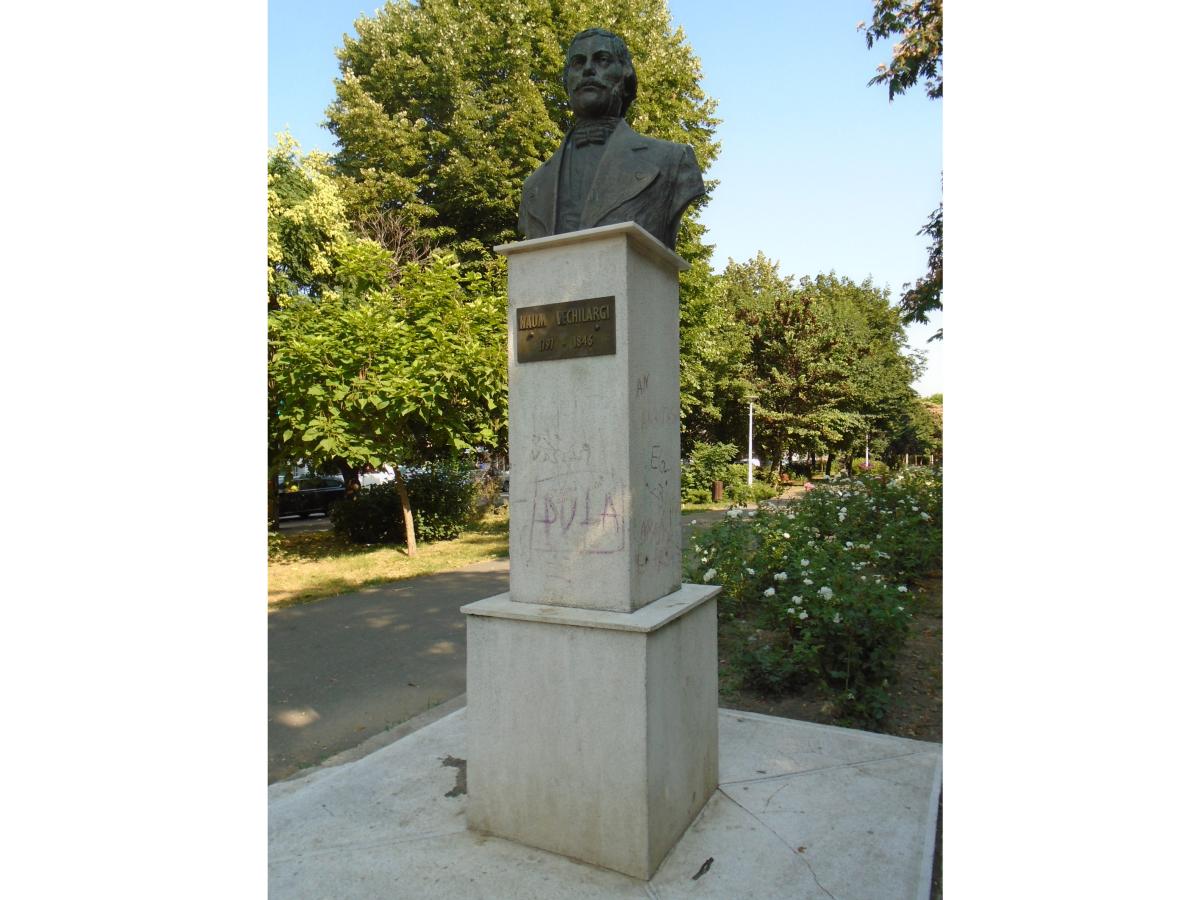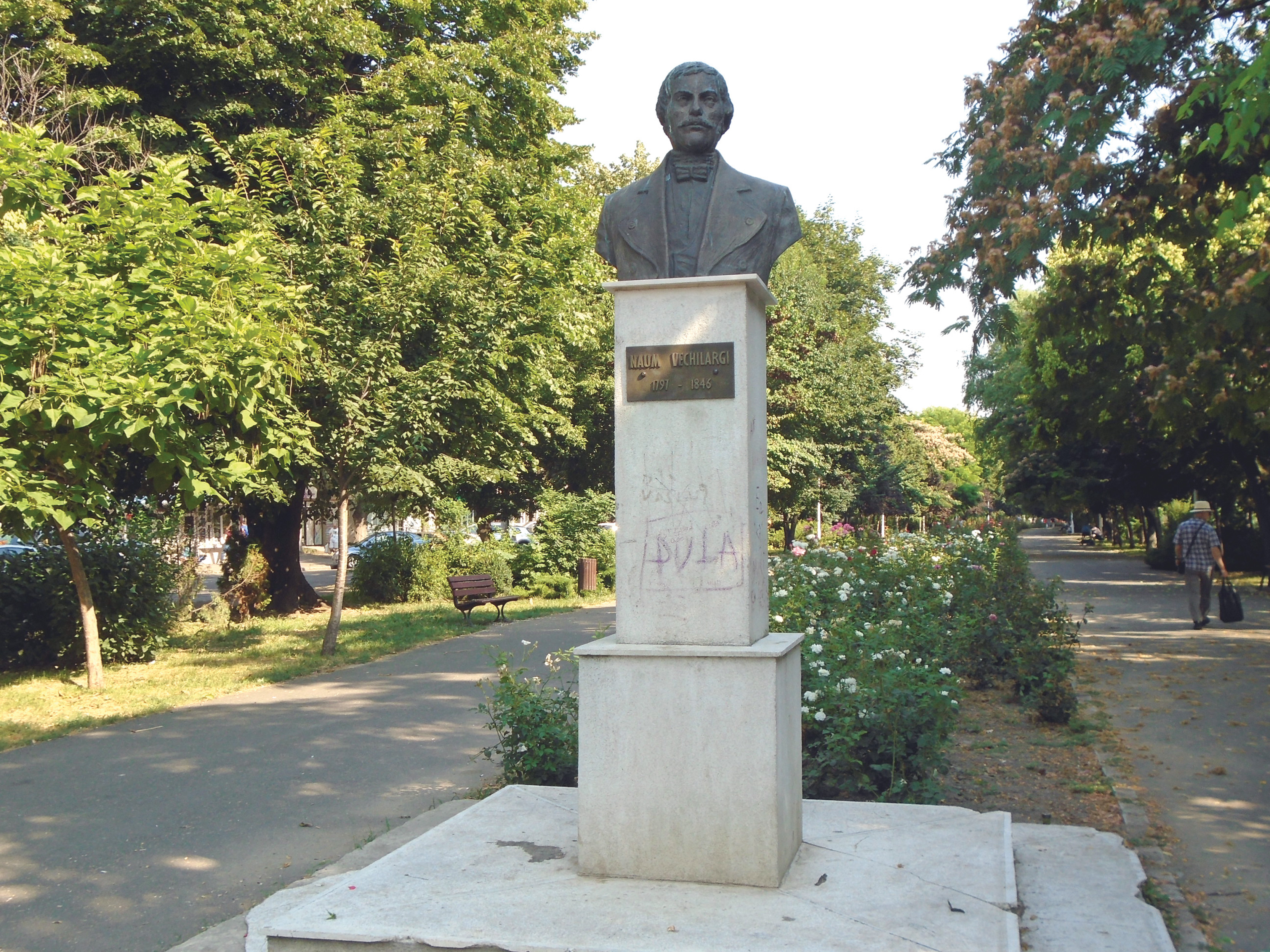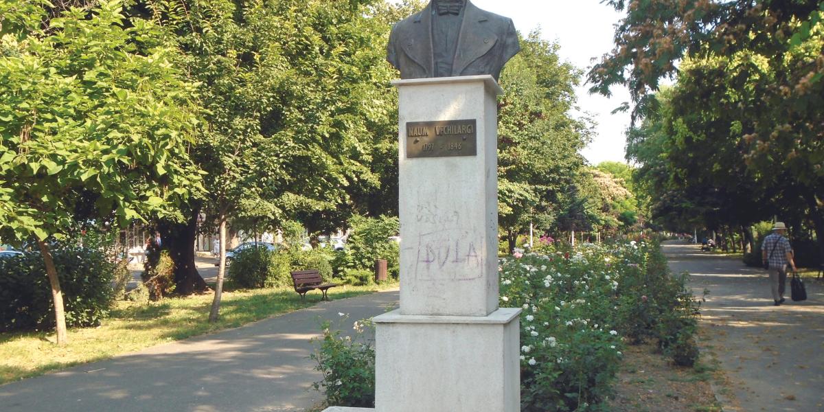 * bustul marelui om de cultură albanez Naum Vechilargi, inaugurat în urmă cu 10 ani, a fost murdărit și inscripționat cu obscenități * nu este pentru prima dată când se întâmplă acest lucru * la doi pași de monument, lângă banca din dreapta, se afla, ieri, o grămadă de coji de semințe de floarea soarelui * promotor al Renașterii Naționale Albaneze, Naum Vechilargi a fost avocat la Brăila, în perioada 1832-1839 și a militat pentru emanciparea poporului albanez