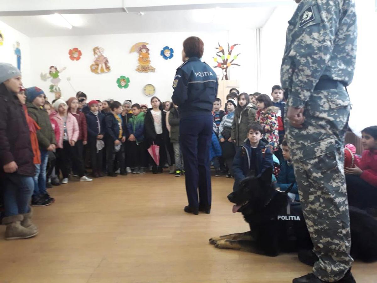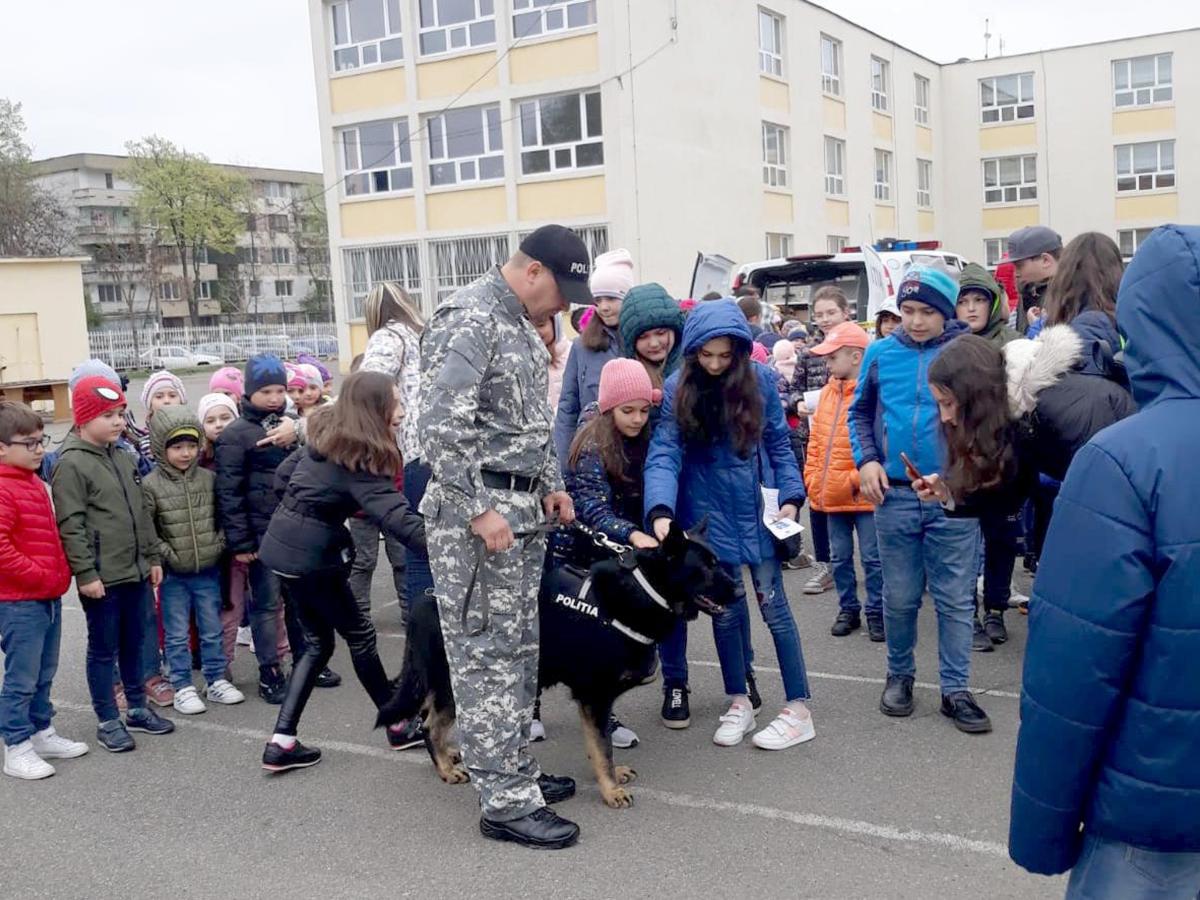 • în cadrul programului “Şcoala Altfel: să ştii mai multe, să fii mai bun!”, oamenii în uniformă au fost alături de elevi şi au discutat pe mai multe teme, oferind sfaturi importante • copiii au avut parte şi de o întâlnire cu “Gipsy”, câinele de urmă al IPJ care acţionează pentru prinderea infractorilor • alţi doi câini poliţişti de patrulare- intervenţie, Vera şi Vam, au prezentat exerciţii spectaculoase pentru cei mici