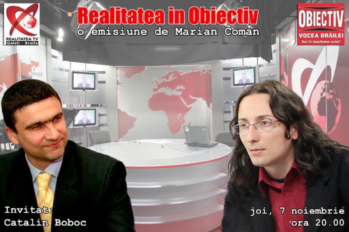 Emisiunea "Realitatea în Obiectiv" din această seară îl va avea ca invitat pe Cătălin Boboc, senator şi totodată preşedinte al organizaţiei judeţene PNL Brăila. Începând cu ora 20:00, liberalul va purta un dialog antrenant cu realizatorul talk-show-ului, Marian Coman, redactorul şef al cotidianului "Obiectiv - Vocea Brăilei". Discuţiile vor fi axate atât pe zona politică, cât şi pe cea administrativă locală.