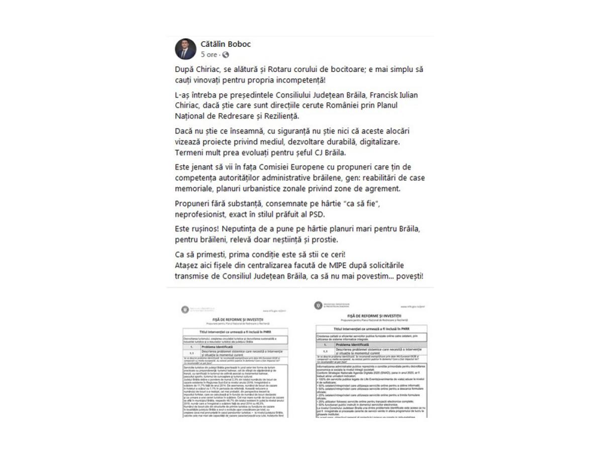 ”După Chiriac, se alătură și Rotaru corului de bocitoare; e mai simplu să cauți vinovați pentru propria incompetență! L-aș întreba pe președintele Consiliului Județean Brăila, Francisk Iulian Chiriac, dacă știe care sunt direcțiile cerute României prin Planul Național de Redresare și Reziliență. Dacă nu știe ce înseamnă, cu siguranță nu știe nici că aceste alocări vizează proiecte privind mediul, dezvoltare durabilă, digitalizare. Termeni mult prea evoluați pentru șeful CJ Brăila. Este jenant să vii în fața Comisiei Europene cu propuneri care țin de competența autorităților administrative brăilene, gen: reabilitări de case memoriale, planuri urbanistice zonale privind zone de agrement. Propuneri fără substanță, consemnate pe hârtie «ca să fie», neprofesionist, exact în stilul prăfuit al PSD. Este rușinos! Neputința de a pune pe hârtie planuri mari pentru Brăila, pentru brăileni, relevă doar neștiință și prostie. Ca să primești, prima condiție este să știi ce ceri!”, a declarat Boboc.