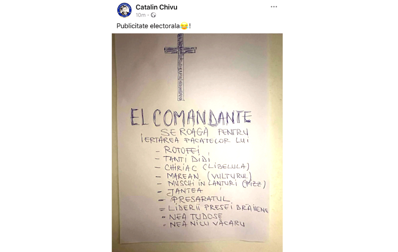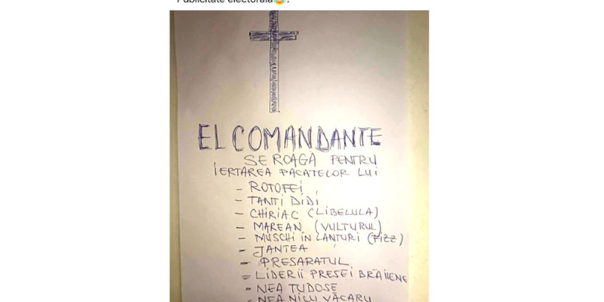 Băi, băiete! Cătălin Chivu, cel mai milițian dintre jurnaliști și cel mai ziarist dintre milițieni, a dat o dumă care ar fi trebuit să ne lase lați! Cam cum l-a lăsat pe el Nea Nicu Ardeleanu, fermierul luptător K1, dacă o credem p-aia cu mâna ruptă. Despre ce este vorba? Păi, Cătălin Chivu zis și El Comandante a publicat pe pagina personală de Facebook, sub o cruce mare, un pomelnic pentru morți. Cică publicitate electorală!!! Numai că morții sunt vii, dar l-au supărat pe Chivu că altfel nu se explică de ce respectivii sunt enumerați sub o cruce mare și neagră. Într-o companie selectă sunt și colegii de la Obiectiv sub denumirea ”liderii presei brăilene”. Daaar, colegii noștri sunt abia pe poziția a 8-a, ce-i drept înaintea lui nea Tudose (europarlamentarul Mihai Tudose) și nea Văcaru (Nicu Ardeleanu) care este ultimul pe lista morților lui Chivu. Pe prima poziție, doamnelor și domnilor, este Rotofeiul (prefectul Iulian Timofei), urmat, atenție!, de tanti Didi (Didi Crintea, directoarea Spitalului Județean de Urgență). Oare cu ce l-o fi deranjat tanti Didi? Nu i-o fi dat medicamente! Da' ce treabă are tanti Didi, că secția ”agitați” este în alt spital. În fine, mai departe urmează Chiriac, zis și Libelula (președintele CJ și-al PSD). Pe locul 4, Marean (Vulturu), primarul municipiului, iar pe poziția a 5-a intră ”Mușchi în lanțuri” care cică ar fi vicepreședintele CJ Ionuț Dobre (PSD). Urmează Jantea (viceprimarul municipiului căruia nu i-a găsit o poreclă) urmat de Presaratul, nu am reușit să identificăm cine se ascunde sub acest ”pseudonim”. Abia apoi, cum spuneam, liderii presei brăilene, Mihai Tudose și Nicu Ardeleanu. Acum, avem două posibilități: Uno, ne rugăm la Dumnezeu să-i dea lui El Comandante ce dorește el celor de pe lista neagră. Având în vedere că ziariștii de la Obiectiv sunt creștini veritabili, ne vom ruga cu toții să-i dea Dumnezeu sănătate lui Cătălin Chivu ca să avem cel puțin noi, de la scormonitoru, de cine să facem mișto. Plus că este cea mai ”bună” campanie electorală pentru cei pe care-i consiliază. De altfel, devine evident că alde Chivu este obsedat de cruci. I-a mai îngropat el pe Marean și Chiriac în campania electorală, la locale, numai că sub sloganul ”Pe 9 iunie vă îngropăm!” a picat taman Canciu, zis și 8 la sută. Așa că succesuri cu noii pretendenți, El Comandante! (Secția de Psihiatrie)
