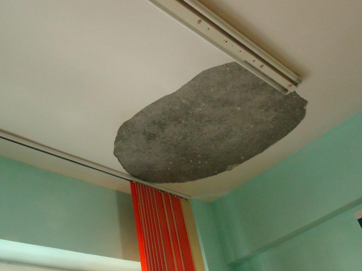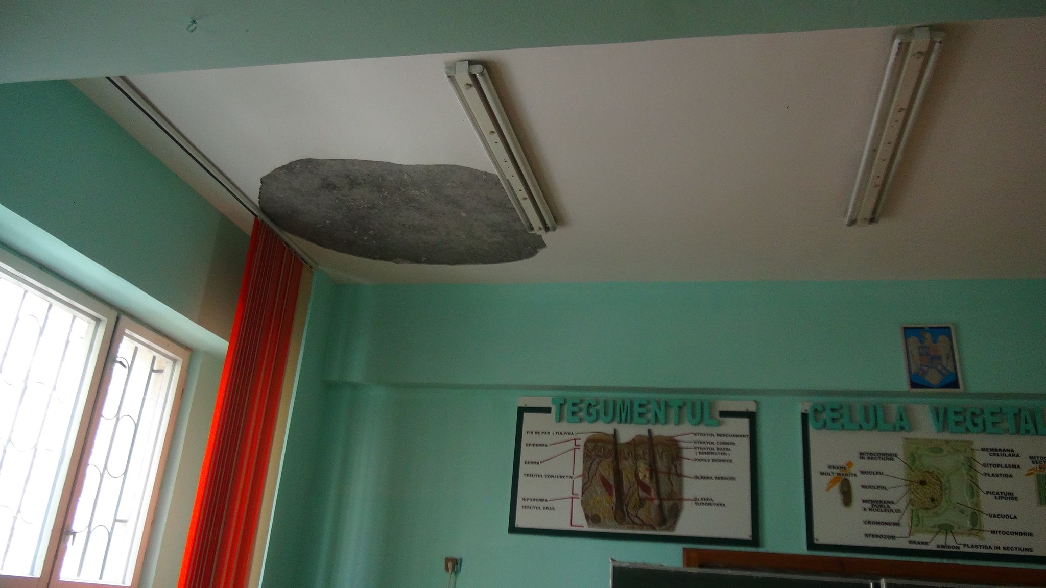 * bucata, de circa 0,5 mp, s-a desprins din colțul stânga al clasei, exact în dreptul catedrei * din fericire, profesoara se afla printre copii și nu a fost rănită