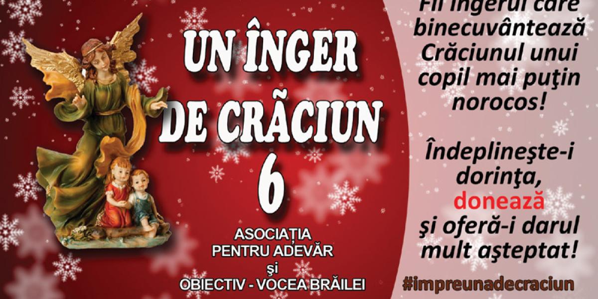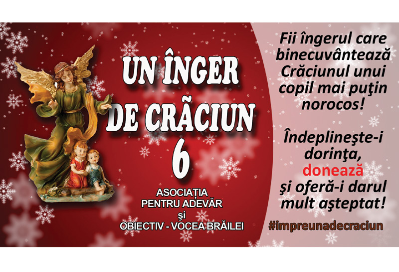 Cea de-a șasea ediție a campaniei “Un înger de Crăciun”, organizată de cotidianul “Obiectiv - Vocea Brăilei” și Asociația “Pentru Adevăr”, cu sprijinul Forumului Tinerilor Brăila, ne-a arătat încă o dată că bunătatea nu cunoaște limite! Zeci de oameni au dorit să fie “îngeri” de Crăciun pentru copiii mai puțini norocoși din municipiul și județul Brăila și astfel am putut distribui toate cele peste 60 scrisori primite până acum pe adresa redacției.
