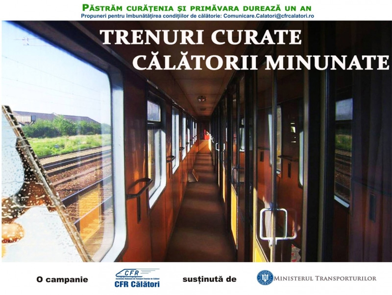 CFR Călători a anunţat că a relansat în această lună, la nivel naţional, Campania „Trenuri curate - călătorii minunate” cu scopul de a oferi publicului un climat plăcut de călătorie. Campania constă în acţiuni de curăţenie, igienizare şi reparaţii la vagoane (salubrizare radicală, curăţare tapiţerie, cabine toalete, etc.);