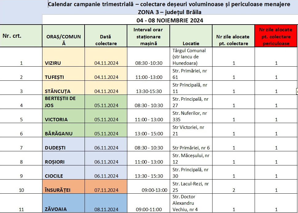 • este vorba despre comunele incluse în Zona 3 de activitate a operatorului de salubritate Polaris - Viziru, Tufești, Stăncuța, Berteștii de Jos, Victoria, Bărăganu, Dudești, Roșiori, Ciocile, Însurăței și Zăvoaia • campania se va derula în perioada 4 - 8 noiembrie, în zilele și punctele de colectare stabilite pentru fiecare comună în parte, așa cum sunt menționate în tabelul atașat acestui articol
