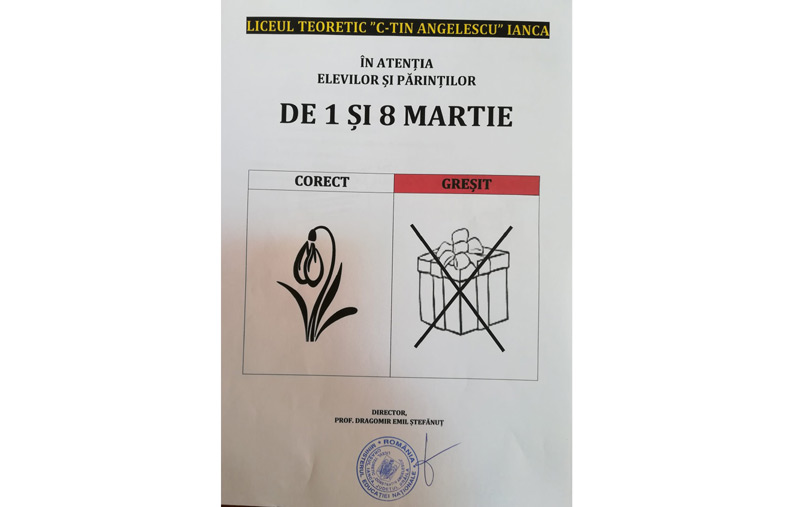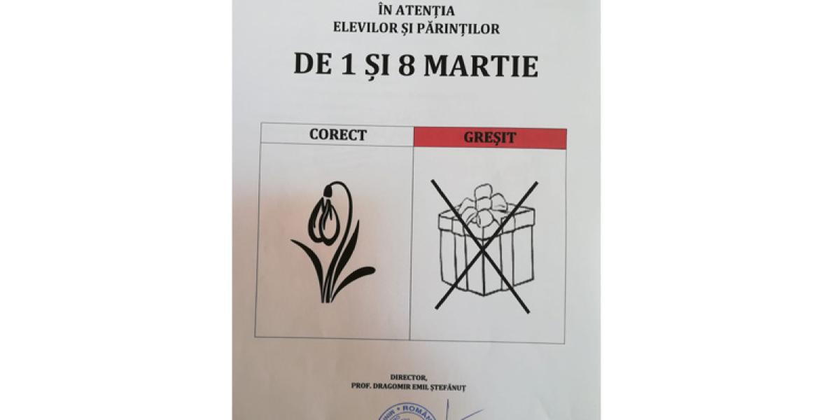 Directorul liceului din Ianca, prof. Emil Ştefănuţ Dragomir, ne-a povestit că din 2016 şi până acum nu a mai observat ca profesorii să fie asaltaţi cu daruri care mai de care mai mari şi mai scumpe. Anul acesta, pe pagina de Facebook a liceului a fost postată o imagine din care reiese faptul că de 1 şi 8 martie oferirea ghioceilor - vestitorii primăverii - sau a unei flori, în general, este un gest frumos şi de bun-simţ, în timp ce oferirea cadourilor este total interzisă. Şi, pentru ca informaţia să ajungă inclusiv în rândul părinţilor, învăţătorii şi profesorii au organizat şedinţe cu aceştia, în care le-au pus în vedere atât regulamentul şcolar, cât şi Codul de etică.