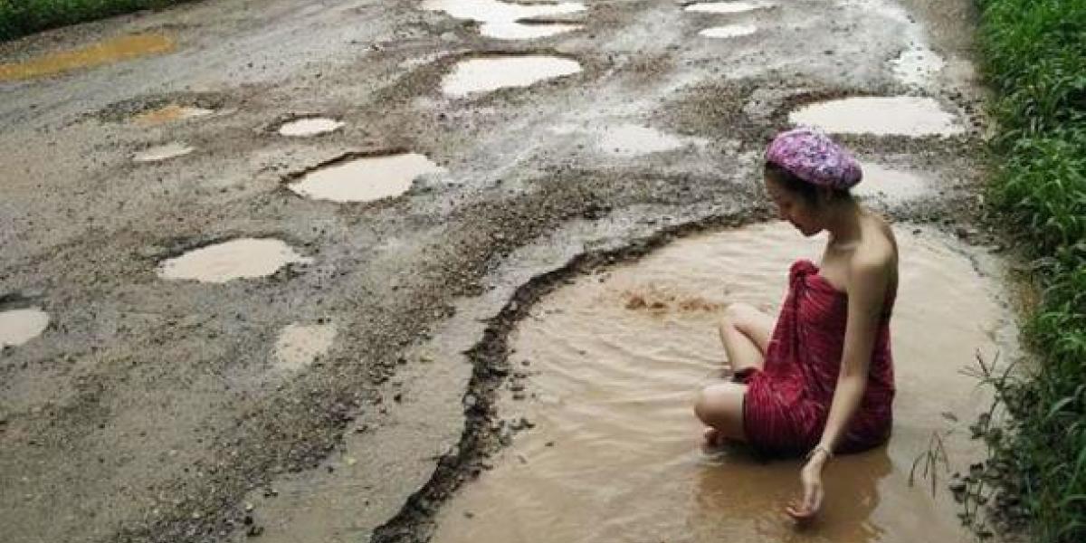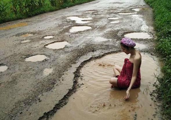 O femeie din Thailanda a inițiat o campanie inedită în semn de protest contra gropilor din asfalt. Fotomodelul din Bangkok, pe nume Palm, și-a pus o cască de duș și un prosop și a făcut baie în apa adunată într-una dintre găurile din drumul către casa rudelor sale din districtul Mae Ramat aflat în provincia Tak, informează BBC citat de Agerpres.