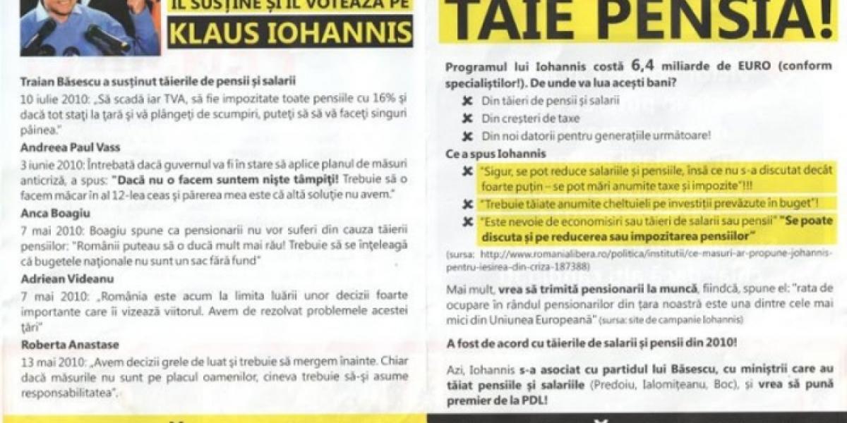Liderii Alianţei Creştin Liberale Brăila au reuşit să interzică difuzarea pliantelor anti-Klaus Iohannis, ce erau distribuite în cutiile poştale ale brăilenilor. Concret, prin intermediul unui comunicat de presă emis ieri şi semnat atât de senatorul liberal Cătălin Boboc, cât şi de deputatul PDL Alexandru Nazare, aceştia au anunţat că Biroul Electoral Judeţean (BEJ) nr.9 Brăila, a admis plângerea ACL privind "pliantele electorale PSD cu propagandă mincinoasă, transmise prin intermediul Poştei Române, ataşate talonului de pensie şi prin care era transmis mesajul - Klaus Iohannis vrea să îţi taie pensia". Cei doi copreşedinţi ACL au apreciat că prin distribuirea acestui pliant către pensionari, prin procedee de intimidare şi santaj emoţional, se aduc grave prejudicii candidatului Klaus Iohannis. "Afirmaţiile mincinoase, folosite de Alianţa electorală PSD-UNPR-PC, inoculează ideea că în eventualitatea alegerii în funcţia de preşedinte a candidatului ACL, Klaus Iohannis, acesta va proceda la tăieri de pensii şi salarii, va creşte taxele şi va contracta noi datorii pentru generaţiile următoare.