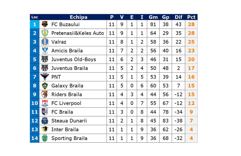Juventus a urcat pe locul al 6-lea, după victoria cu 7-4 obținută în fața echipei de pe locul al 8-lea, Galaxy. Emanuel Pârlițeanu a înscris trei goluri pentru echipa “bătrânilor”, Juventus Old-Boys, în confruntarea cu Liverpool”, a comentat Paul Stoian, organizatorul Campionatului de Minifotbal Brăila.
