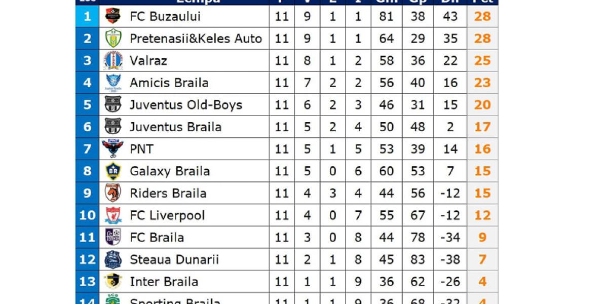 În etapa a 11-a, primele două clasate, FC Buzăului și Pretenașii&Keleș Auto, au făcut o ultimă verificare înaintea meciului direct dintre ele care este programat în runda următoare. Ambele au obținut victorii categorice. Echipa de pe locul al treilea, Valraz, s-a chinuit să obțină o victorie la limită, 6-5, în partida cu ocupanta locului al 13-lea, Inter Brăila.