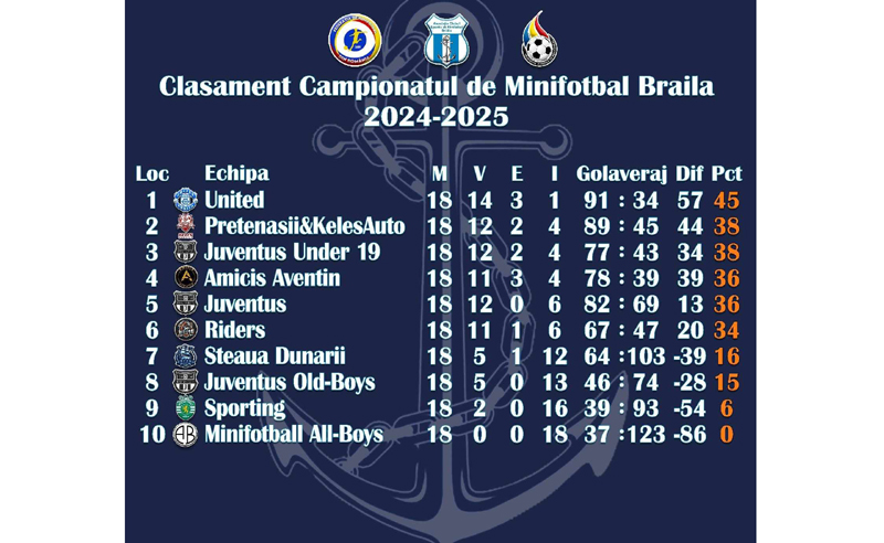 Campionatul de Minifotbal Brăila și-a derulat ultima etapă din sezonul regulat, cea de a 18-a, urmând ca această competiție să intre în faza a doua, în care primele cinci clasate se vor “duela” în turneul play-off, celelalte cinci în turneul play-out.