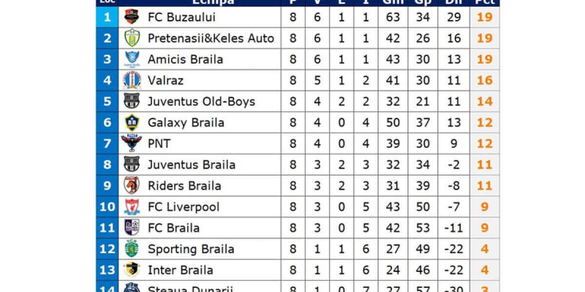 În etapa a 8-a a Campionatului de minifotbal Brăila, primele trei clasate au obținut victorii pe linie. Scorul rundei a fost stabilit de liderul campionatului, FC Buzăului, care s-a impus cu 9-4 în “duelul” cu penultima clasată, Inter Brăila. Formația de pe locul secund, Pretenașii & Keleș Auto, a câștigat tot la scor, 7-2, partida cu echipa de pe locul al 12-lea, Sporting. Doar ocupanta locului al treilea, Amicis, a trecut la limită, 3-2, de Juventus Old-Boys, locul al cincilea.