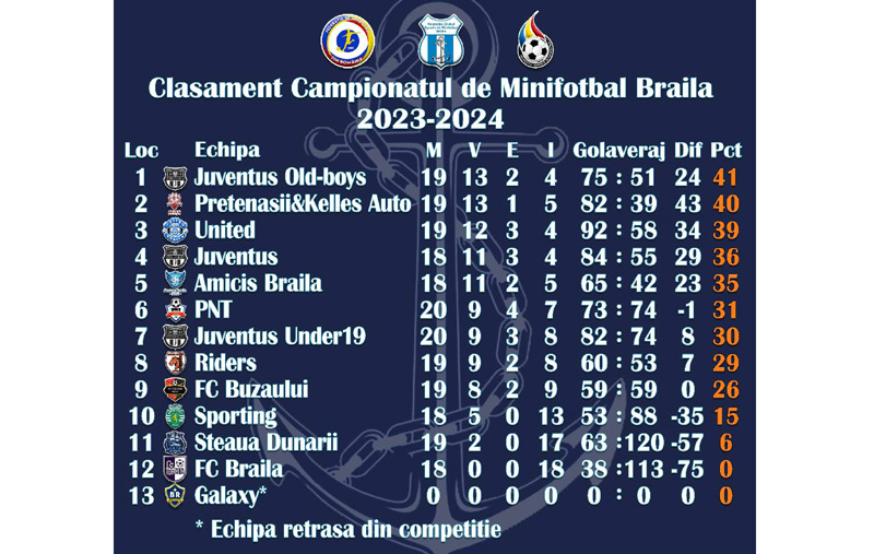 Pe primele cinci locuri se află următoarele formații: 1. Juventus 41 puncte, 2. Pretenașii&Keleș-Auto 40 puncte, 3. United 39 puncte, 4. Juventus 36 puncte, 5. Amicis 35 puncte.