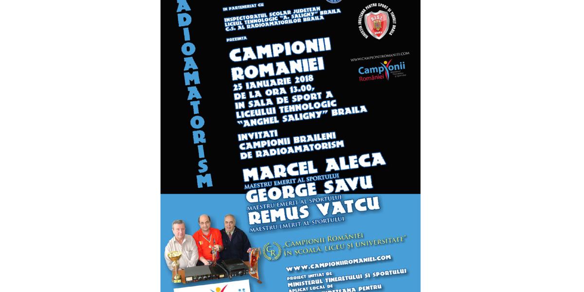 Joi, 25 ianuarie 2018, de la ora 13.00, în sala de sport a Liceului Tehnologic “Anghel Saligny” are loc o nouă acţiune din cadrul proiectului naţional “Campionii României în şcoală, liceu şi universitate”, invitaţii Direcţiei Judeţene pentru Sport şi Tineret (DJST) Brăila fiind campionii din radioamatorism. Mai precis Marcel Aleca, maestru emerit al sportului, George Savu, maestru al sportului şi Remus Vatcu, maestru al sportului. Trei campioni, cu rezultate naţionale şi internaţionale deosebite, care au dus performanţa şi creativitatea tehnică la un nivel extrem de ridicat pentru radioamatorism şi pentru sporturile denumite cândva “tehnico-aplicative”.