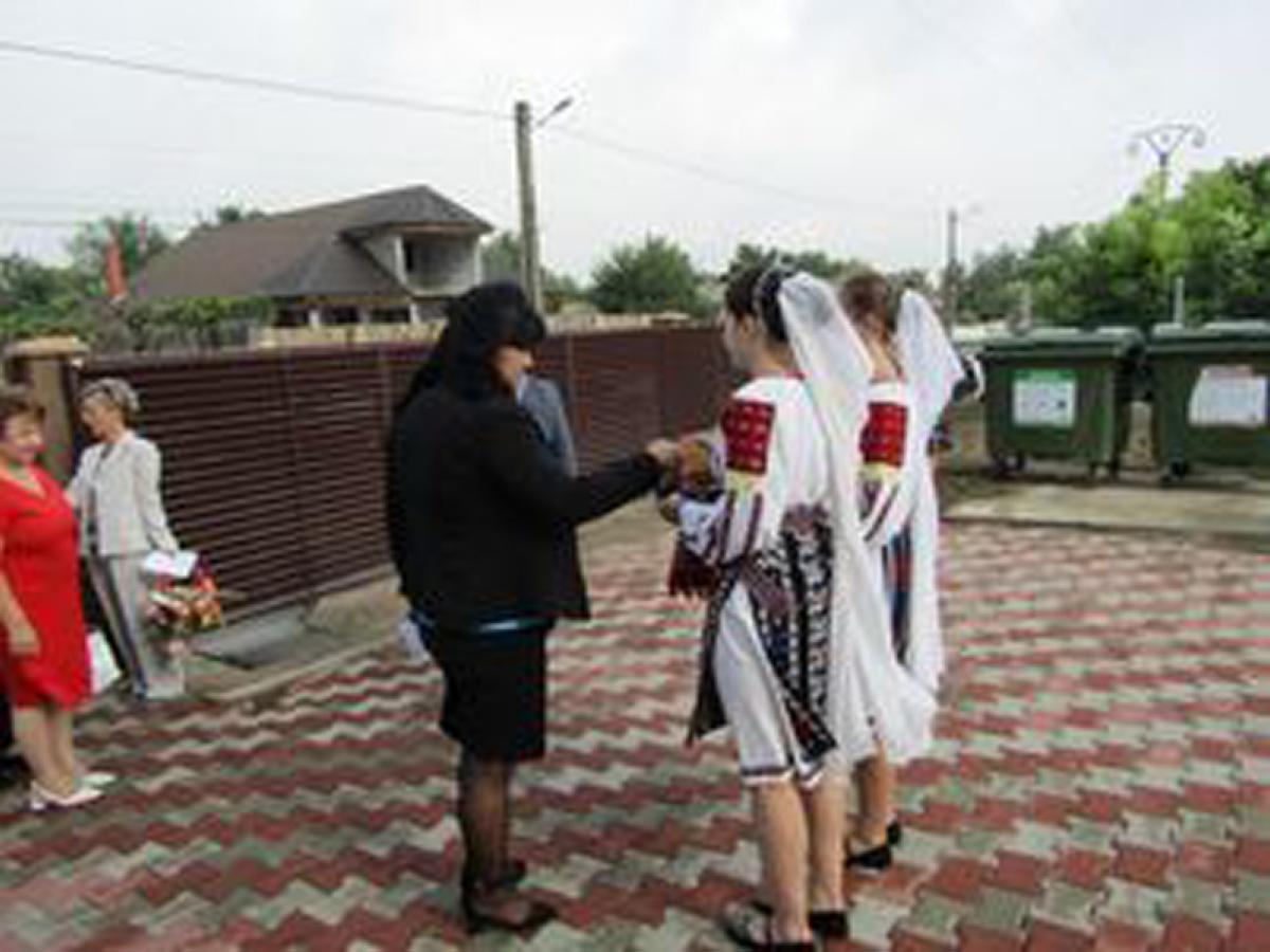 Invitații au fost primiți cu tradiționala pâine și sare și apoi au trecut printr-un culoar format din elevi care aveau câte o floare în mână.