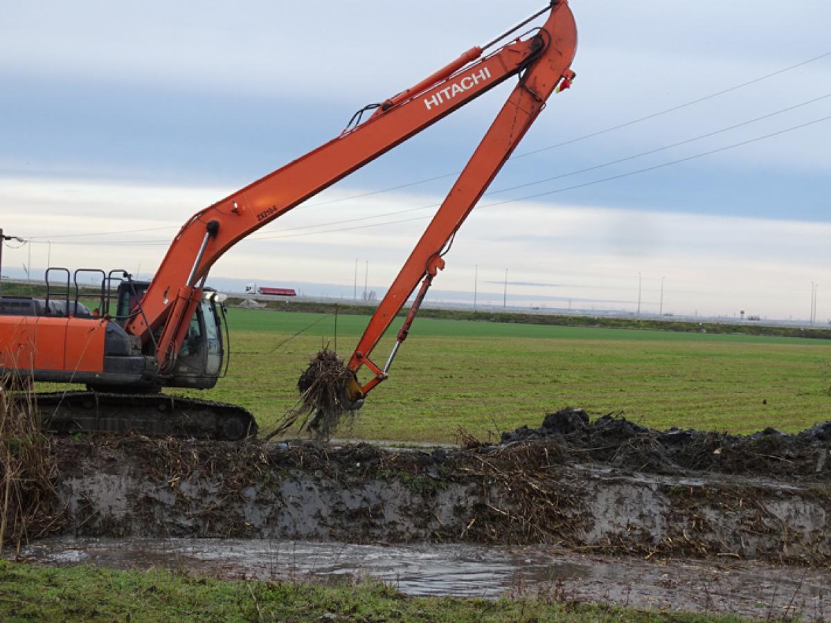 • în perioadele ploioase, cum a fost cea din luna decembrie, se vede importanța sistemelor de desecare de pe câmpurile Brăilei, care au rolul de a prelua excesul de apă pentru a împiedica formarea de bălți care să afecteze culturile agricole • din păcate, multe dintre canalele de desecare nu pot funcționa normal pentru că sunt înfundate atât cu mâlul depus de-a lungul anilor cât și cu tone de deșeuri aruncate de tot felul de inconștienți • pentru a face față situației, ANIF Brăila a început în regim de urgență să decolmateze trei canale principale de pe sectorul Brăila - Dunăre - Siret, în lungime totală de 44 kilometri • din cauza volumului mare de muncă, lucrările înaintează greu, cu doar câteva sute de metri pe zi