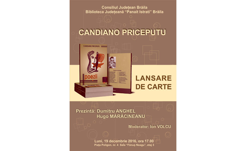 Luni, 19 decembrie 2016, ora 17.00, la sala „Fănuş Neagu” a Bibliotecii Judeţene „Panait Istrati” va avea loc lansarea volumului „Poezii”, semnat de Candiano Priceputu. Cartea va fi prezentată de prof. Dumitru Anghel şi artistul plastic Hugo Mărăcineanu, iar evenimentul va fi moderat de Ion Volcu, şef birou în cadrul instituţiei gazdă.