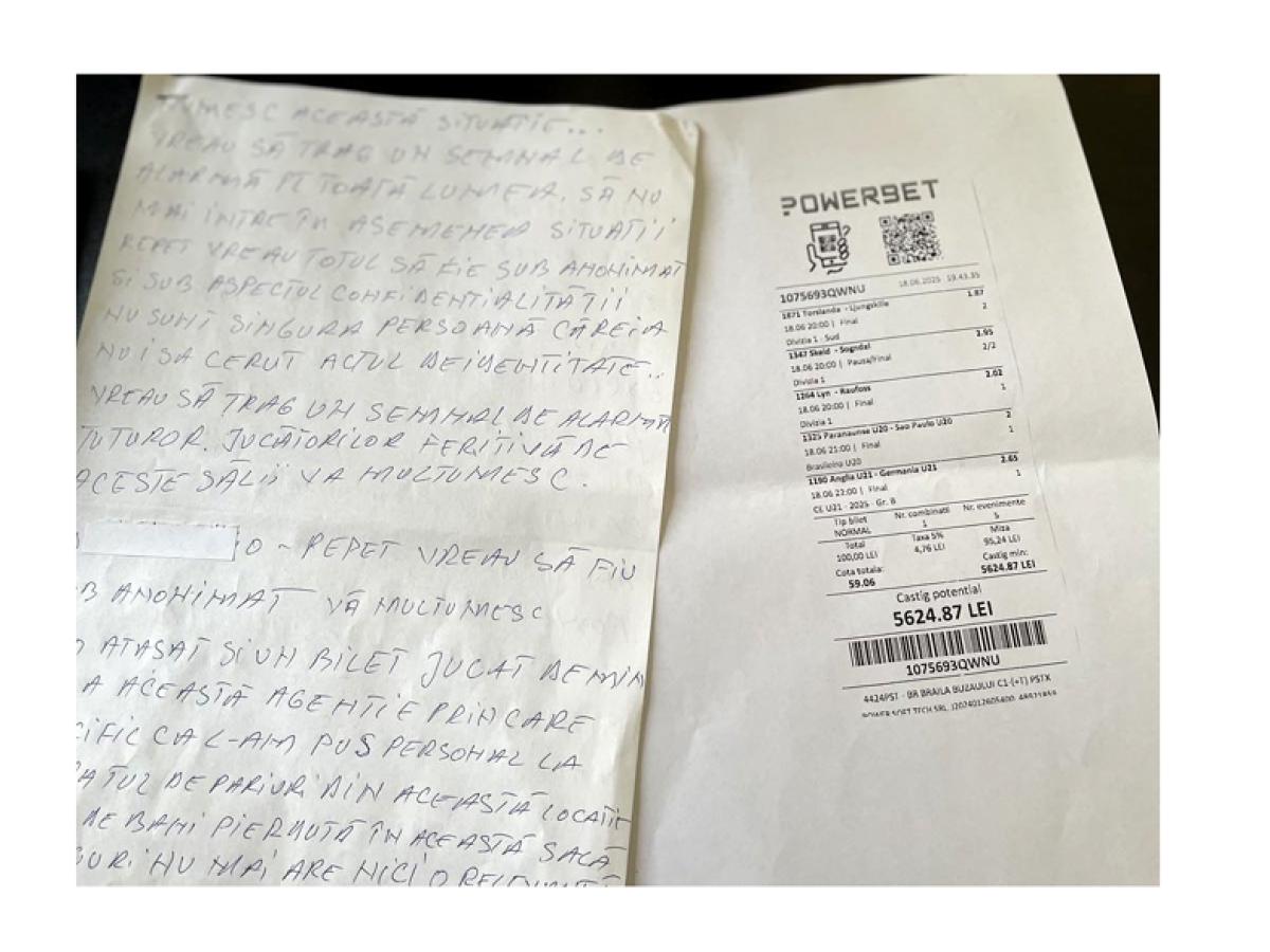 ”Sub anonimat vreau să vă aduc la cunoștință aspecte referitoare la o întâmplare pe care am pățit-o. Sunt exclus de ONJN (Oficiul Național pentru Jocuri de Noroc), am autoexcludere, în baza solicitării pe care am depus-o online, deci nu am acces în săli cu aparate de jocuri și pariuri. Cu toate acestea, am fost lăsat să joc la păcănele și pariuri, într-o sală de jocuri, asta pentru că nu mi s-a cerut cartea de identitate la intrare, pentru a se vedea că am interdicție. Am jucat la o sală numită Power Bet din Brăila, situată pe Șoseaua Buzăului, unde este stația de taxiuri și un magazin fast-food, sală aflată vizavi de Școala 27. Am jucat o anumită sumă de bani și vreau să precizez că am fost efectiv jefuit, tâlhărit, nu știu cum să numesc această situație. Vreau să trag un semnal de alarmă pentru toată lumea, să nu mai intre și alte persoane în asemenea situații. Vreau ca totul să fie sub anonimat și sub aspectul confidențialității, în ceea ce mă privește. Nu sunt singura persoană căreia nu i s-a cerut actul de identitate la acea sală. Vreau să trag un semnal de alarmă tuturor jucătorilor: feriți-vă de aceste săli de jocuri. Aceste jocuri de noroc crează dependență, iar eu am ajuns la disperare, am familie, sunt șofer, am fost și taximetrist, am fost și prin afară, dar vreau și eu să trăiesc liniștit, fără a mai pierde bani la sălile de jocuri. Am trimis cerere online pentru autoexludere la ONJN și au trimis actul care confirmă interdicția, deci dacă se verifică după buletin și se vede că nu am voie să joc, sunt condus afară. La alte săli am fost verificat și nu mi s-a permis să joc. Aici am fost lăsat să joc și m-am dus de nenumărate ori”, ne-a declarat bărbatul bolnav de jocuri de noroc.