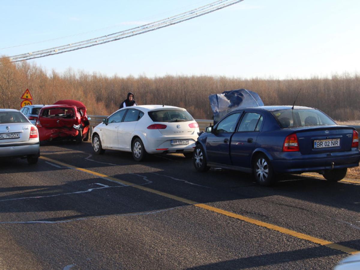 * un eveniment rutier care a încurcat traficul pe dig Brăila - Galați și a dat bătăi de cap șoferilor aflați în zonă, a avut loc luni dimineață * nebunia a început în jurul orei 8.30, după ce un brăilean care conducea un vehicul pe sensul de mers Brăila-Galați, ar fi lovit autoturismul aflat în fața sa * acesta se afla oprit la semaforul din zona șantierului podului peste Dunăre, iar în urma impactului cinci autoturisme aflate în coloană au fost avariate * traficul s-a blocat, iar trei persoane au fost rănite și au ajuns la spital