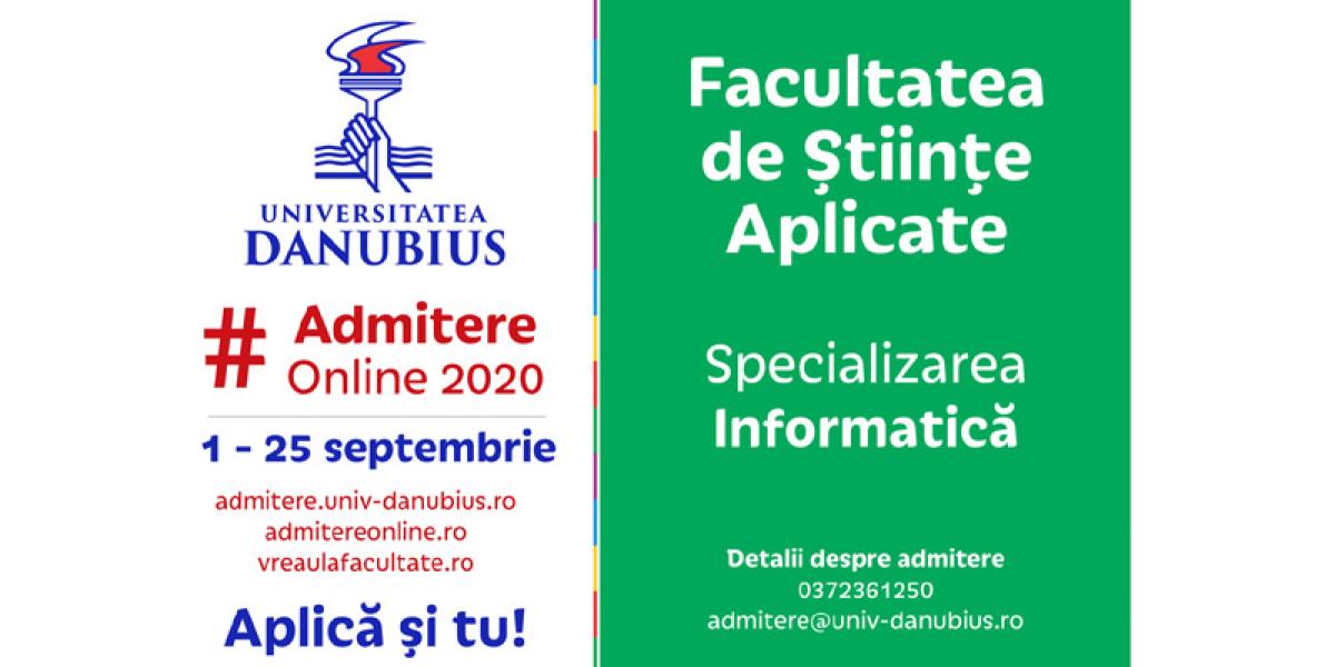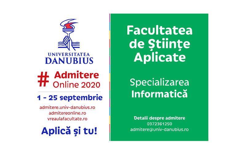 Până pe data de 25 septembrie, se pot înscrie la noul program de studii din cadrul Facultăţii de Ştiinţe Aplicate a Universităţii “Danubius” din Galaţi: INFORMATICA.