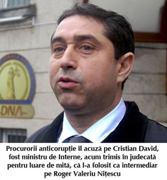 Potrivit rechizitoriului, fostul ministru Cristian David a primit banii, în februarie 2008, prin intermediul lui Roger Niţescu, de la o persoană care l-a denunţat ulterior la DNA.