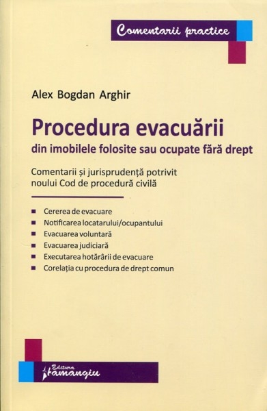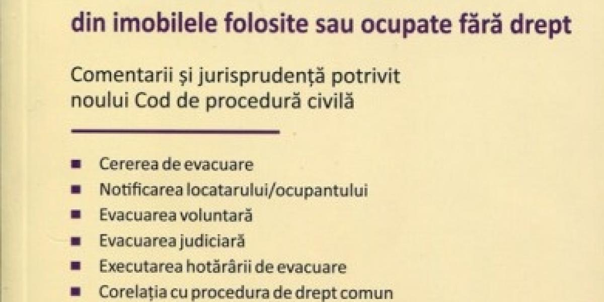 Din paginile acestui volum, cei interesaţi pot afla care sunt procedurile evacuării din imobilele folosite sau ocupate fără drept, care este domeniul de aplicare, care este rolul instanţei competente, ce presupune o cerere de evacuare, cuprinsul şi forma cererii de chemare în judecată, ce se înţelege prin posibilitatea pârâtului de a invoca lipsa titlului reclamantului, în ce condiţii se poate executa hotărârea de evacuare etc. De asemenea sunt explicaţi anumiţi termeni de specialitate şi diferite proceduri specifice.