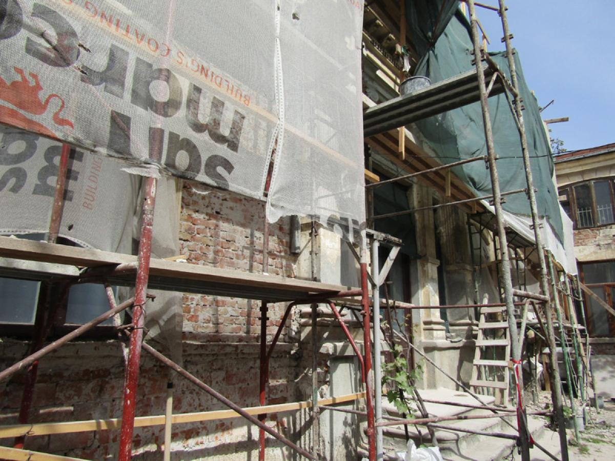 Amănunte despre reabilitare aflăm de la maistrul Teodor Gurgu, care de 7 ani îi are alături pe ipsosarii săi specializaţi în reabilitarea clădirilor de epocă: Marin Minea, Costel Negoiţă, Ionel Samson şi Vasile Duţu. Ei vor lua totul de la “zero”, mai întâi la faţadă şi într-o curte interioară mică; foarte greu accesibilă din îngusta şi foarte periculoasa stradă Hepites, unde este un trafic auto intens, deoarece dinspre Călăraşi/Cuza spre Piaţa Traian se circulă pe un singur sens. Lucrările la imobil sunt prevăzute până în toamna acestui an şi constau în refacerea/decopertarea de la cărămidă a faţadei interioare; tencuieli pe 160 mp din totalul de 400 mp ai clădirii; înlocuirea acoperişului şi a burlanelor. Iar la a doua etapă, pentru faţadele exterioare de pe Hepites şi Ana Aslan, se vor ataca în funcţie de sumele primite. “Evident că în activitatea constructorilor sunt incluse şi interioarele, tâmplăria din lemn etc. Şi, cum ne-am învăţat, lucruri de mare fineţe şi răspundere. Este vorba de capiteluri, frize, console, ancadramente, cornişe etc. Pentru care vom executa perfect negativele şi matriţele specifice ornamentaţiei clădirii”, ne-a declarat maistrul Teodor Gurgu.