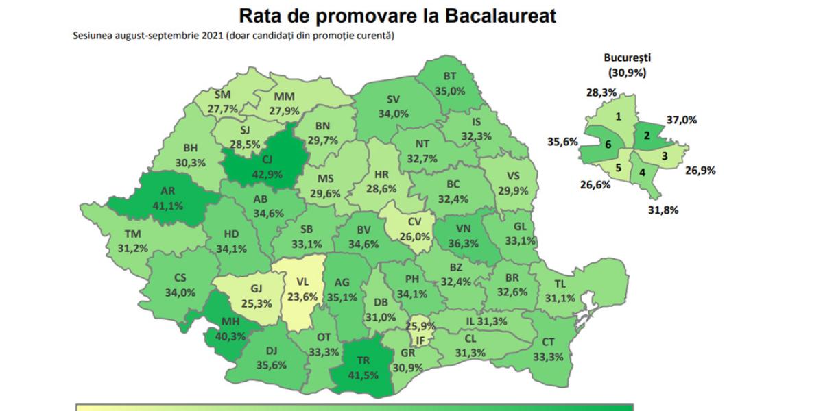 Așa cum a transmis printr-un comunicat de presă Ministerul Educației, rata de promovare la sesiunea a doua a examenului de Bacalaureat este 30,3%, mai mică față de cea de anul trecut, atunci când procentul candidaților promovați a fost 31,5%. Rata de succes pentru promoția 2020-2021 este 32,3%, iar pentru promoțiile anterioare promovabilitatea este 26,3%.