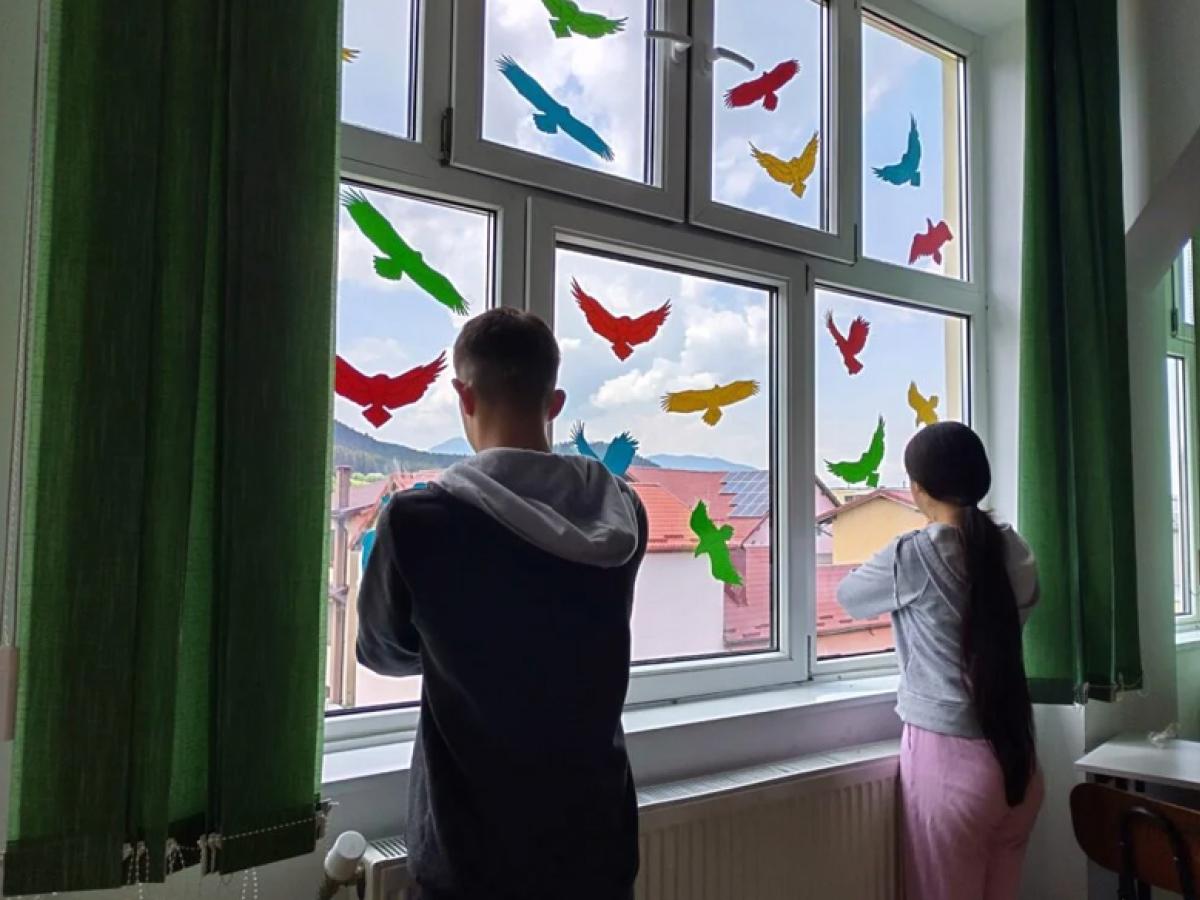 Una dintre activitățile preferate de elevi este amplasarea siluetelor sau a altor elemente de decor pe sticla ferestrelor sau ușilor.