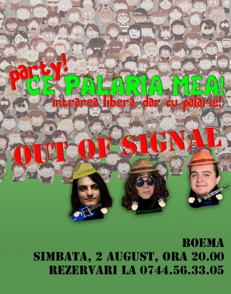 Sâmbătă seara, începând cu ora 20, terasa de vară a restaurantului Boema va deveni scena unei petreceri inedite la Brăila: Ce pălăria mea! Pe lângă pălăriile pregătite de organizatori oaspeţii sunt aşteptaţi să contribuie cu propria garderobă pentru a anima atmosfera. La rândul lor, băieţii de la "Out of Signal" (Alex - tobe şi voce, Ionuţ - bass şi voce, Silviu - chitară solo şi voce) "vor pune pe masă" cele mai "arzătoare" hituri, întregind astfel atmosfera. Surpriza serii o va constitui însă prezenţa lui Lucian Sabados, managerul teatrului Maria Filotti, care va urca pe scenă în calitate de jazzman şi va susţine un recital la clapă alături de "Out of Signal".