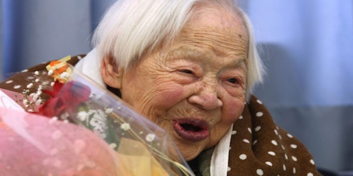 Misao Okawa, provenind dintr-o veche familie de comercianţi de kimonouri din oraşul Osaka, a fost vizitată în azilul de bătrâni în care locuieşte de primarul acestui oraş japonez, Takehiro Ogura, care i-a oferit un buchet de flori, potrivit mediafax.ro.