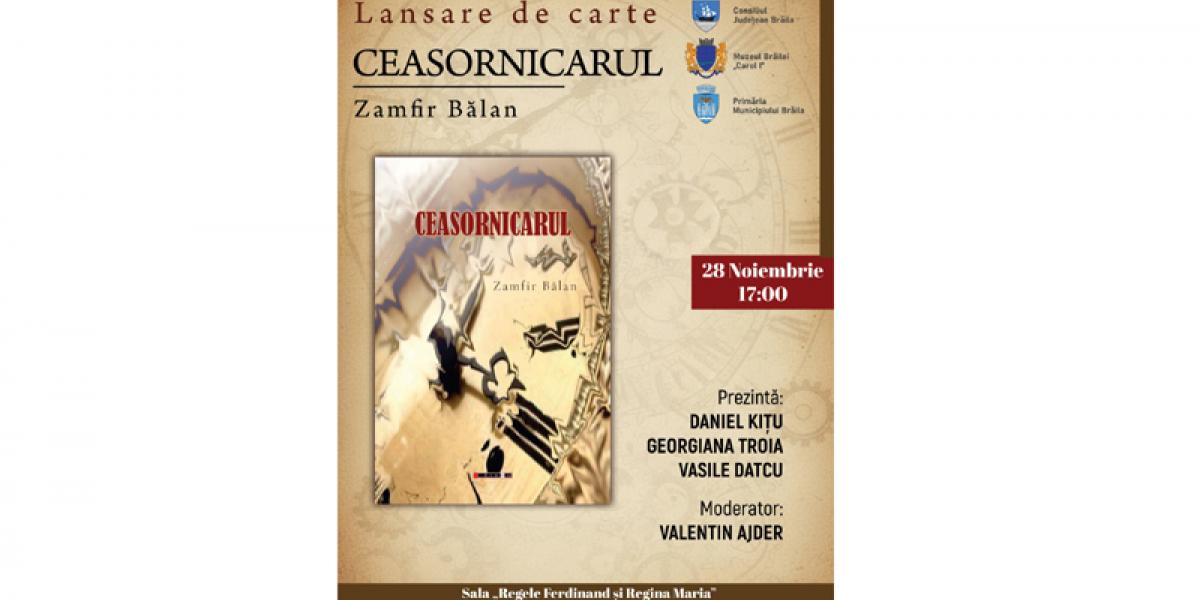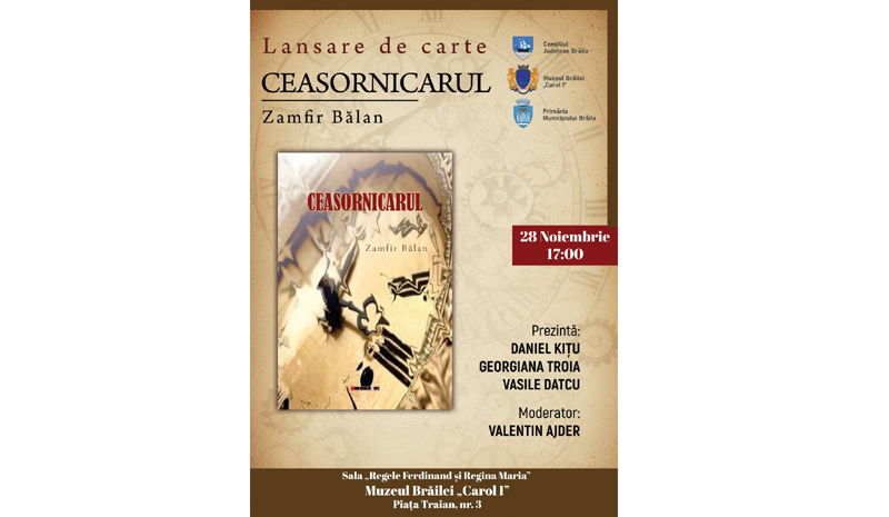 Sala „Regele Ferdinand I și Regina Maria” a Muzeului Brăilei „Carol I” (Piața Traian nr. 3) găzduiește vineri, 28 noiembrie, de la ora 17:00, lansarea volumului de povestiri „Ceasornicarul”, de Zamfir Bălan, apărut la Editura Eikon.