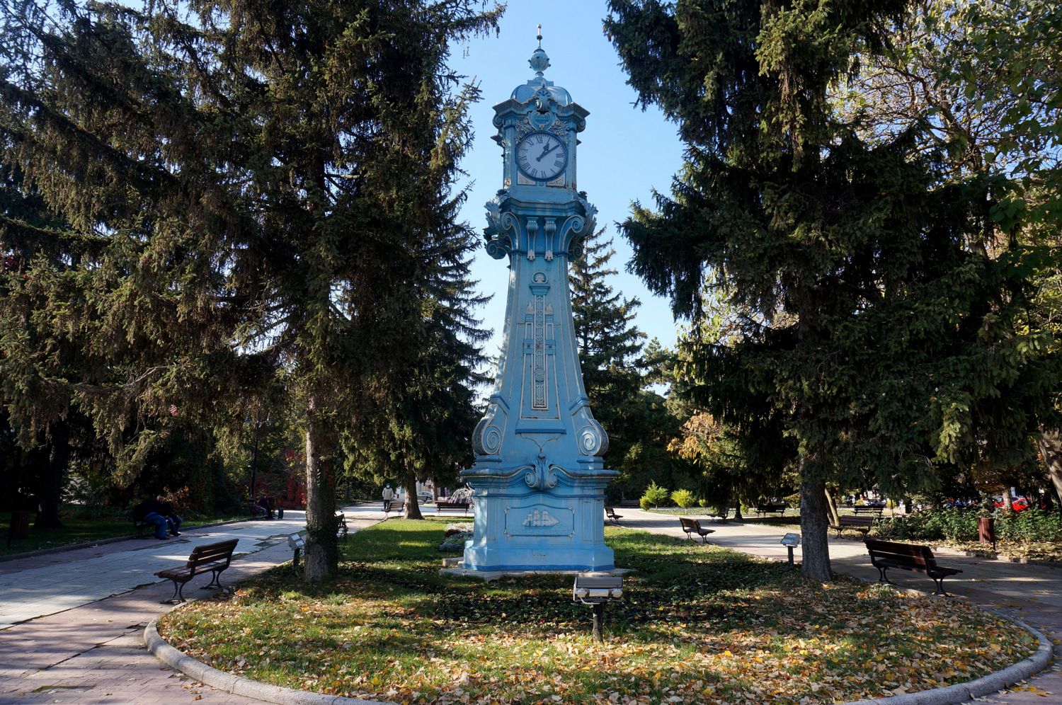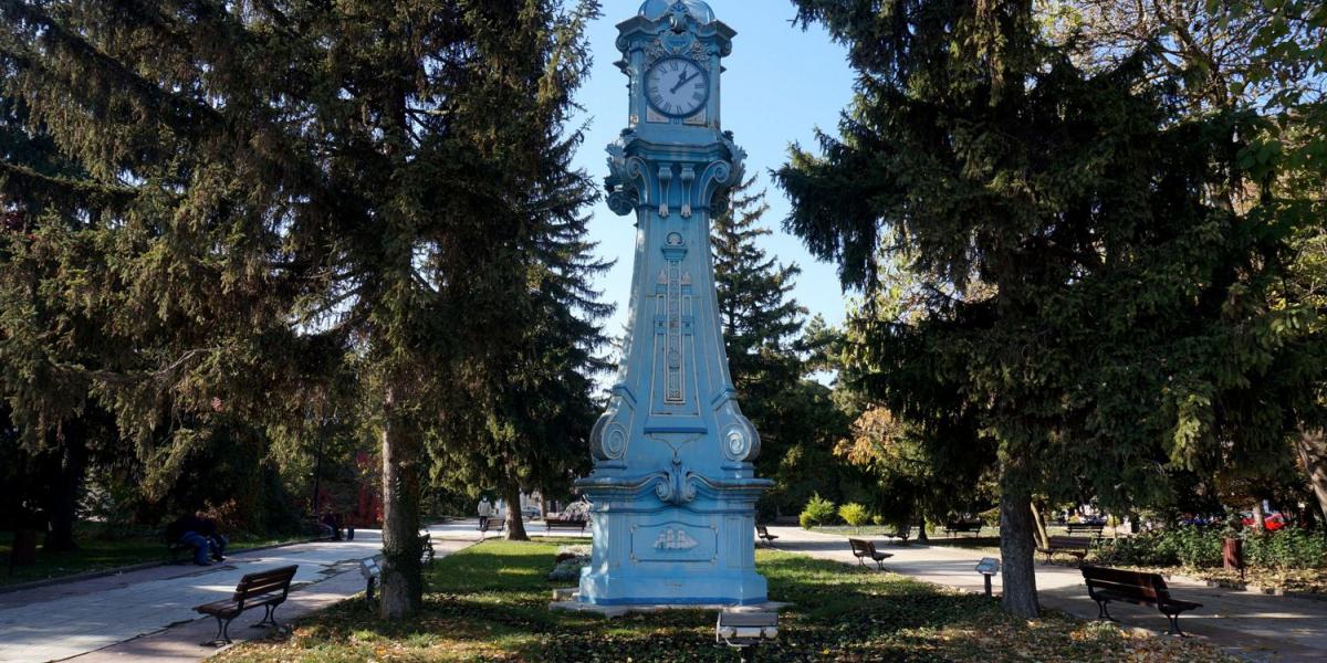 Ceasul-turn din Piața Traian a fost construit în 1909, ca o împlinire a visului unuia dintre cetățenii de vază ai orașului. Este vorba despre Petru Naum care, în 1898, a donat municipalității, prin testament, 8.000 de lei aur pentru ridicarea „unui turn din metal, cu un ceasornic mare în vârf, în Piața Sf. Arhangheli Mihail și Gavril”. De la început, orologiul-turn a fost considerat o piesă de mobilier urban foarte rară, deoarece în epocă ceasurile publice se montau fie în turnurile bisericilor, fie pe alte construcții administrative, fiind arareori construite ca obiective de sine stătătoare. Turnul a fost realizat din tablă, ranforsată în interior cu profile metalice prinse în nituri, de firma cehă Carol Sakar. Mecanismul propriu-zis a fost făcut la Munchen, un mecanism cu greutăți proiectat să se armeze o dată la trei zile. Din cauza structurii de rezistență a turnului de susținere, sistemul de greutăți nu poate face cursa completă, astfel că orologiul cu patru cadrane trebuie întors mai des, o dată la 24 de ore.