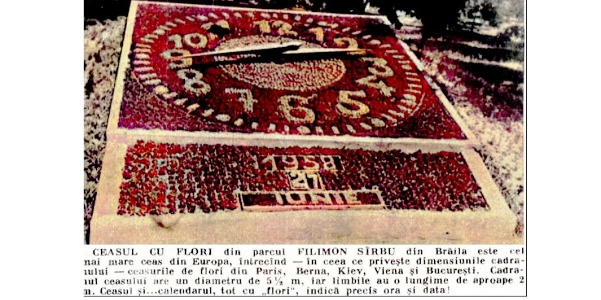 Entuziastul colecționar de fotografii de epocă Valerică Butoi, care postează frecvent pe rețelele sociale imagini cu Brăila de altădată, a publicat zilele trecute un extras din revista Flacăra - ediția iunie 1958 - cu o poză a Ceasului Floral din Grădina Mare, însoțită de o scurtă prezentare. Aflăm de acolo că, în 1958, parcul cunoscut în prezent cu denumirea Grădina Mare se numea, în urmă cu mai bine de 60 de ani, ”Filimon Sîrbu” și că ceasul floral era la vremea aceea ”cel mai mare din Europa, întrecând - în ceea ce privește dimensiunile cadranului - ceasurile cu flori din Paris, Berna, Kiev și București. Cadranul ceasului are un diametru de 5 metri și jumătate, iar limbile au o lungime de aproape 2 metri. Ceasul și ... calendarul, tot cu flori, indică precis ora și data!”. Ce-i drept, după cum se poate vedea în acea fotografie, brăilenii chiar aveau de ce să fie mândri cu ceasul lor cu cadran din flori: cifrele bine definite și armonios poziționate erau o încântare pentru ochi, iar citirea orei era foarte ușor de făcut, atât din apropiere cât și de la mare distanță. În plus, era afișată și data completă: ziua, luna și anul.