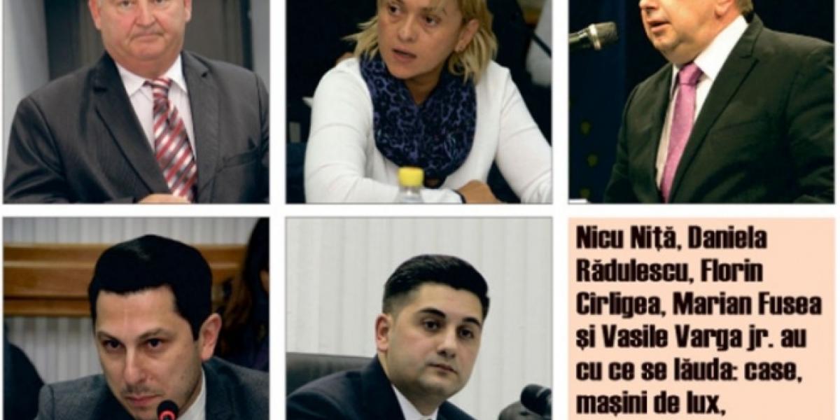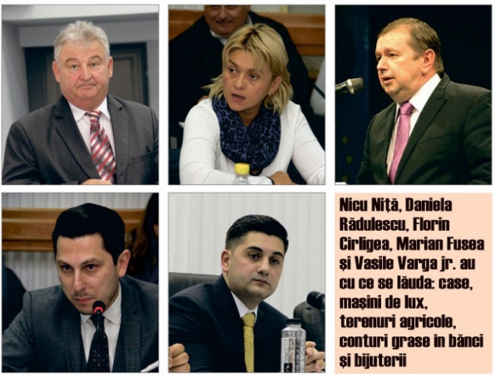 Să trecem acum în revistă şi averile din Consiliul Judeţean. Primele 3 locuri din punct de vedere al veniturilor anuale declarate sunt consilierii PNL Florin Cîrligea - 1,65 milioane lei, Vasile Varga junior - 0,94 milioane lei şi Vasile Broască - 0,82 milioane lei. Ca o paranteză, cei 3 liberali sunt singurii care au declarat şi bijuterii: 20.000 euro la Cîrligea, 5.000 euro la Varga şi 10.000 USD la Broască. Sunt urmaţi de Simona Drăghincescu (PND) - venituri de 175.291 lei, Marian Căpăţână - 170.543 lei, dar şi Dan Şerbu (PSD) - 162.753 lei. Când introducem în formula de departajare şi celelalte criterii precum active imobiliare şi financiare, lucrurile se schimbă radical în sensul că în top urcă vertiginos, de exemplu, Niţă Nicu (PSD) cu cele aproape 138 ha de teren agricol, 10.832 mp de intravilan, cele două case plus alte 3 case de vacanţă şi plasamente în propriile firme de 3,89 milioane lei. Şi Viorel Mortu a strâns în bănci sume frumuşele - 145.455 lei, dar şi Ionel Avram, cu 275.509 lei.