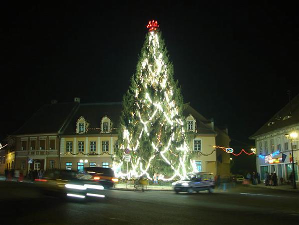 Cel mai înalt brad de Crăciun din România măsoară 42 de metri şi se află la Cisnădie. Mulţi localnici sunt mândri de noua faţă a oraşului şi cred că investiţia de 15.000 de euro face toţi banii.