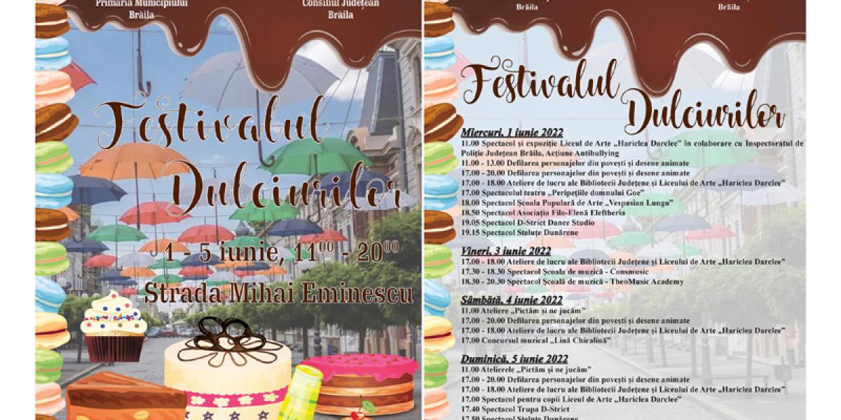 De 1 Iunie, Ziua Internațională a Copilului, Primăria Municipiului Brăila și Consiliul Județean Brăila dau startul celui mai “dulce” eveniment: Festivalul Dulciurilor. Anul acesta, evenimentul se întinde pe cinci zile, în perioada 1-5 iunie, timp în care brăilenii mici și mari sunt așteptați să se plimbe pe Strada Mihai Eminescu și să se oprească la căsuțele de lemn pentru a încerca bunătățile pregătite de comercianți.