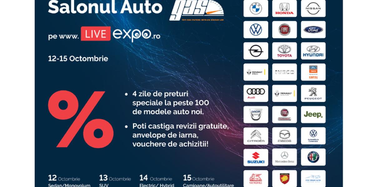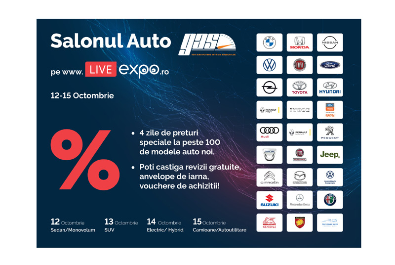 Cel mai mare Salon Auto Digital, GAS2020 se vede live in online intre 12-15 Octombire exclusiv pe http://www.liveexpo.ro. In 4 zile de eveniment la categoriile Sedan/Monovolum (12 Oct.), SUV (13 Oct.), Hybrid/Electric (14 Oct.), Camioane/Autoutilitare (15 Oct.), iti prezentam peste 100 de modele auto noi, ultimile tendinte precum si cele mai bune oferte din piata auto 2020. Vezi, compari, obtii oferte cu discount de pana la 30% si cumperi printr-un singur click folosind sistemele automatizate ale platformei www.liveexpo.ro . Poti castiga prin tragere la sorti Revizii gratuite, anvelope de iarna,vouchere de achizitie si multe alte premii. Preinregistreaza-te pe https://www.liveexpo.ro/signup si bucura-te de beneficii! Salonul Auto Digital GAS2020 pe http://www.liveexpo.ro. incepand cu ora 18:00 a fiecarei zile de eveniment. Ne vedem in digital!