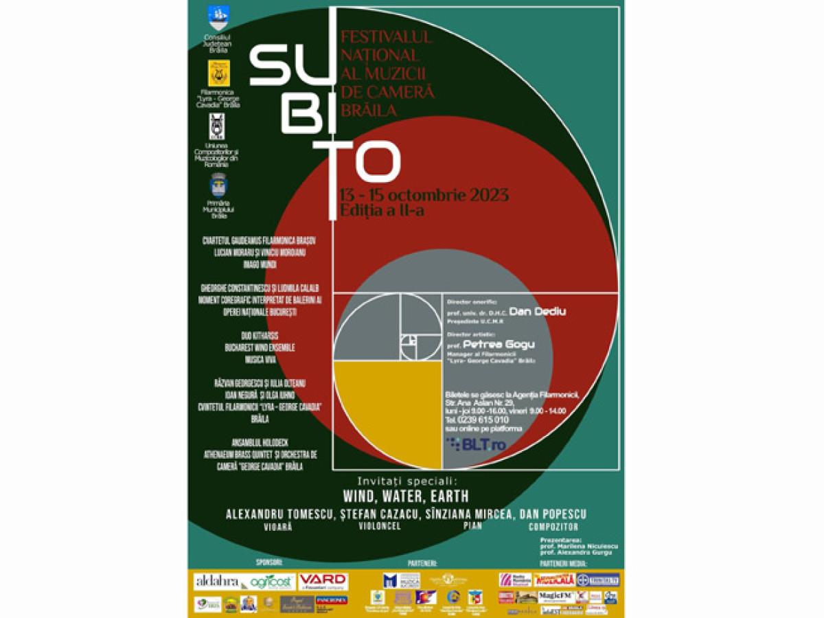 Începe, astăzi, Festivalul Național al Muzicii de Cameră SUBITO - ediția a II-a, care se desfășoară în perioada 13-15 octombrie, la Brăila. Cele mai multe spectacole se desfășoară pe scena Casei Tineretului, dar și la sediul Filarmonicii „Lyra - George Cavadia” Brăila, din Strada Ana Aslan nr. 29. Ansamblul Holodeck, Athenaeum Brass Quintet/ABQ și Orchestra de Cameră „George Cavadia” Brăila vor evolua în seara zilei de duminică, 15 octombrie 2-23, la Casa Tineretului. Invitați speciali sunt celebrul violonist Alexandru Tomescu (cu a sa vioară Stradivarius Elder Voicu, inclusă în Patrimoniul Cultural Național - categoria Tezaur), violoncelistul Ștefan Cazacu, pianista Sînziana Mircea și compozitorul Dan Popescu.