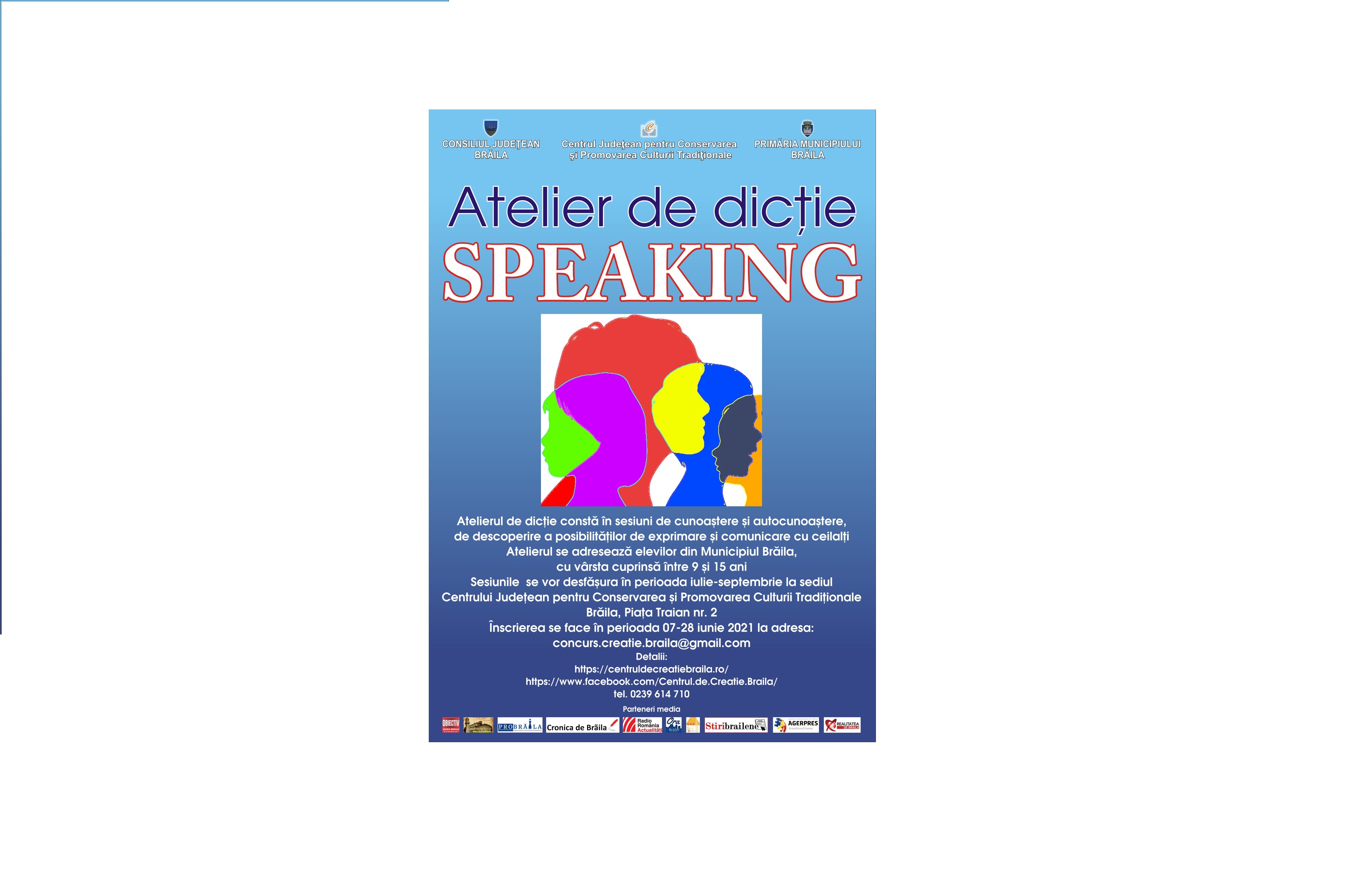 Atelierul de dicţie constă în sesiuni de cunoaştere şi autocunoaştere, de descoperire a posibilităţilor de exprimare şi comunicare cu semenii noştri, precizează surse din cadrul Centrului de Creaţie. Sesiunile se vor desfăşura în perioada iulie - septembrie 2021 la sediul Centrului Judeţean pentru Conservarea şi Promovarea Culturii Tradiţionale Brăila - Centrul de Creaţie din Piaţa Traian nr. 2.