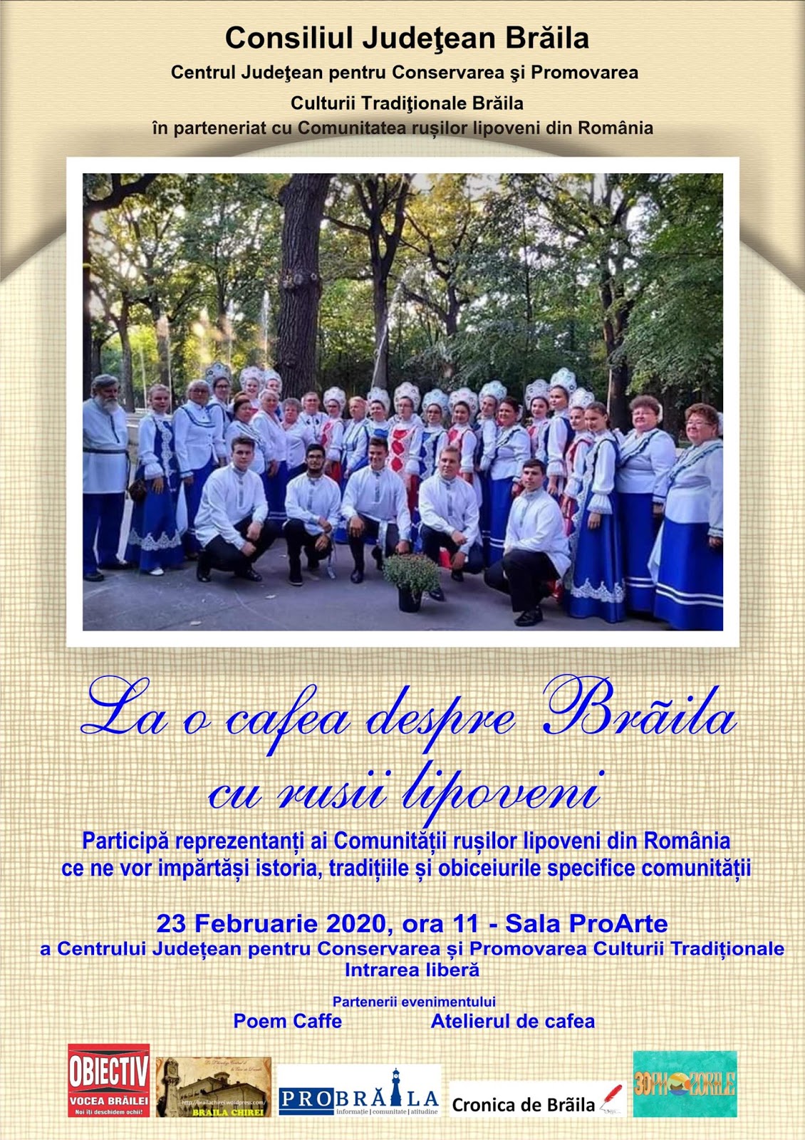 Duminică, 23 februarie 2020, de la ora 11,00, în Sala ProArte a Centrului Judeţean pentru Conservarea şi Promovarea Culturii Tradiţionale Brăila, din Piaţa Traian, nr. 2 va avea loc o manifestare intitulată “La o cafea despre Brăila cu ruşii lipoveni”. La evenimentul organizat de Consiliul Judeţean Brăila, prin Centrul Judeţean pentru Conservarea şi Promovarea Culturii Tradiţionale vor participa reprezentanţi ai Comunităţii ruşilor lipoveni din România, care vor împărtăşi istoria, tradiţiile şi obiceiurile specifice comunităţii, iar intrarea este liberă.