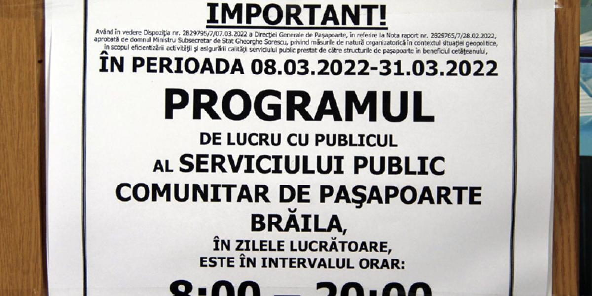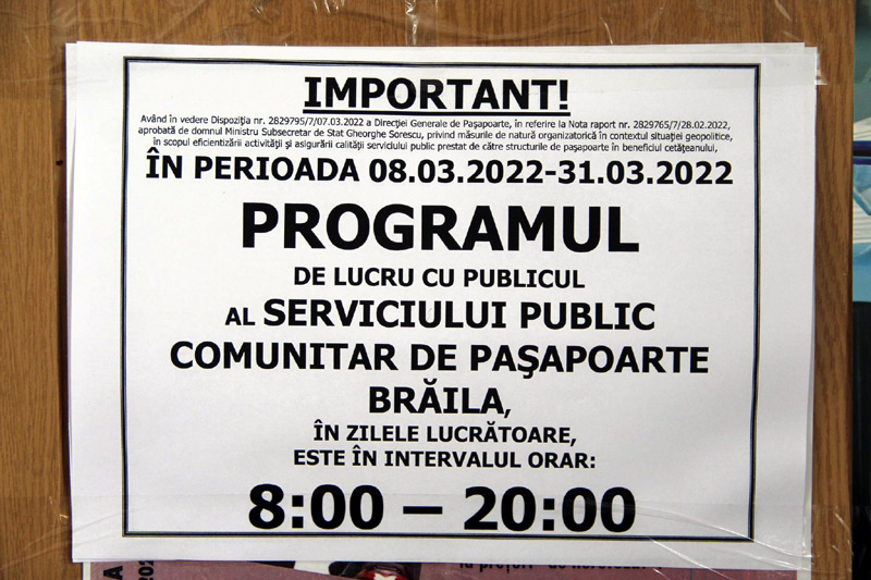 * brăilenii au început să se înghesuie pentru a-și scoate pașapoarte, multe persoane fiind speriate de conflictul armat din apropierea țării noastre * dacă înainte de izbucnirea războiului erau 100 de cereri pe zi, acum se primesc 300 de cereri * totuși, de la Serviciul Comunitar de Pașapoarte Brăila se dau asigurări că situația este echilibrată, programul fiind prelungit până la ora 20.00
